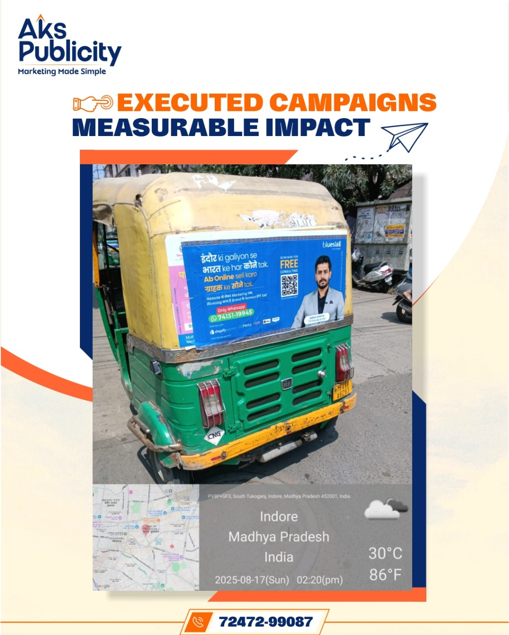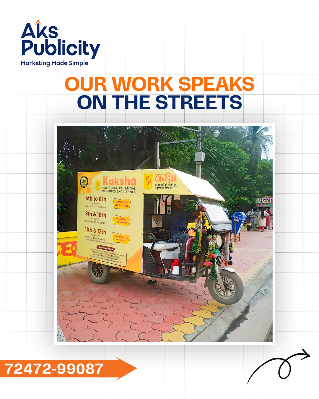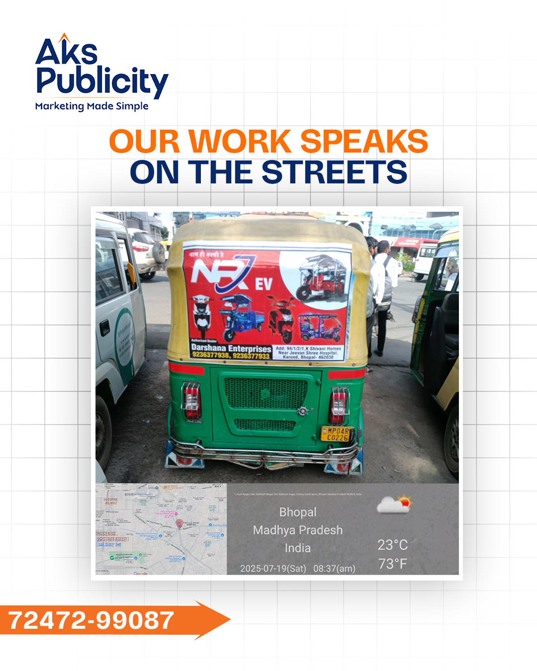 At AKS Publicity, we don’t just place ads — we design journeys. From innovative auto hood advertising to impactful marketing, our campaigns ensure your message travels through markets, signals, and streets, creating impressions that stick long after the ride ends.